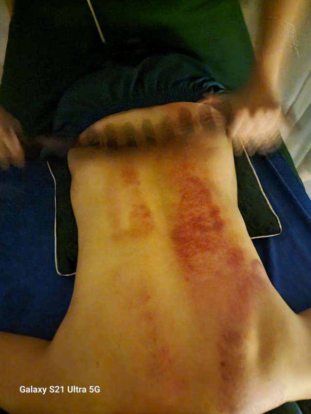 - Dùng dụng cụ cạo nhẹ nhàng lên da: Kỹ thuật viên sẽ cạo lên vùng da theo hướng từ trên xuống dưới, từ trong ra ngoài với lực vừa phải. Màu sắc của vết cạo trên da giúp chẩn đoán sức khỏe, với các vết đỏ thẫm hoặc xanh tím thường cho thấy cơ thể đang gặp vấn đề.