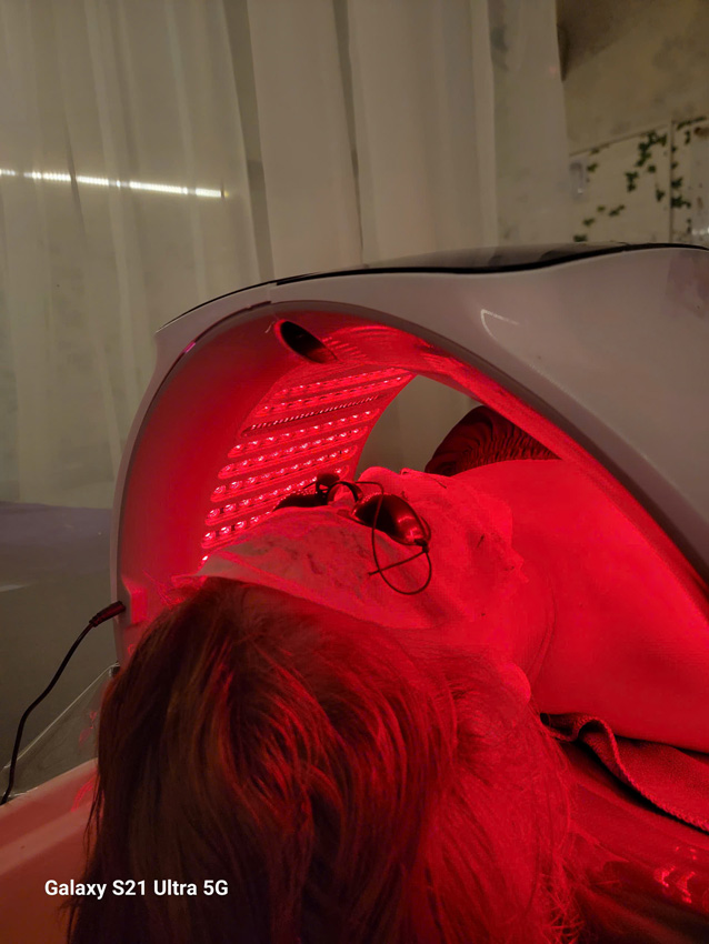 Đắp mặt nạ chuyên biệt giúp làm dịu và nuôi dưỡng da. Kết hợp với ánh sáng đỏ, da được kích thích tái tạo, tăng cường sản sinh collagen.